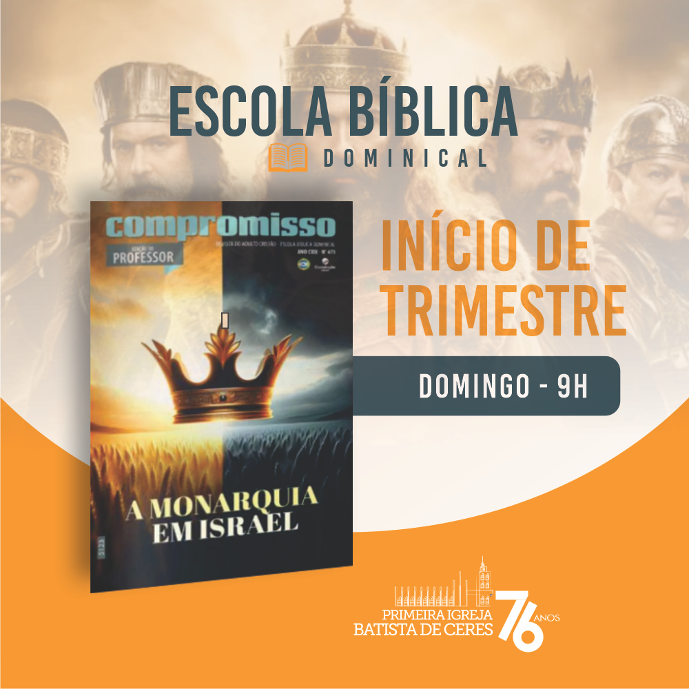 Os jovens e adultos caminharão neste início de ano de estudos sobre a monarquia em Israel. Esse período marca a transição do período dos juízes sem um poder central para um sistema de governo com poder centralizado. Será a oportunidade de meditar nos exemplos de vida de reis e profetas, ver como Deus opera na história do seu povo e verificar a mão de Deus operando por meio das limitações daqueles que eram chamados para liderar o povo.